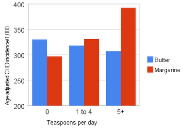 I came across an interesting study the other day, courtesy of Dr. John Briffa's blog. It's titled "Margarine Intake and Subsequent Coronary Heart Disease in Men", by Dr. William P. Castelli's group. It followed participants of the Framingham Heart study for 20 years, and recorded heart attack incidence*. Keep in mind that 20 years is an unusually long follow-up period.
