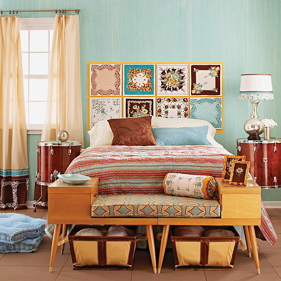 Bring the head of your bed into bloom with a sweet bouquet of vintage hankies. Mounted on square artist's canvases, they became colorful works of art that pack a powerful punch when grouped en masse. Apricot paint on the wall subtly frames the ensemble .